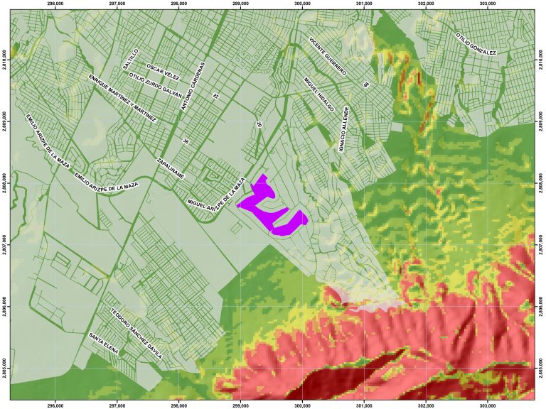 El proyecto se desarrolla en dos predios de 10.5 Ha. y 25.9 Ha. Se cuenta con Uso de Suelo Habitacional con una densidad H3 (densidad media de 33 Viv./Ha.).En promedio el terreno presenta pendientes que van del 5 al 9% con excepción de algunas zonas de escurrimientos naturales con pendientes de hasta 40%. Con un rendimiento del 45%, el proyecto incluye 686 lotes unifamiliares de 205 m2 en promedio y 103 departamentos, además de un área comercial de conveniencia de 4,618 m2 y un área para una escuela de 11,097 m2, lo que permite generar más de 65,000 m2 de áreas verdes, recreativas y corredores urbanos peatonales arbolados.