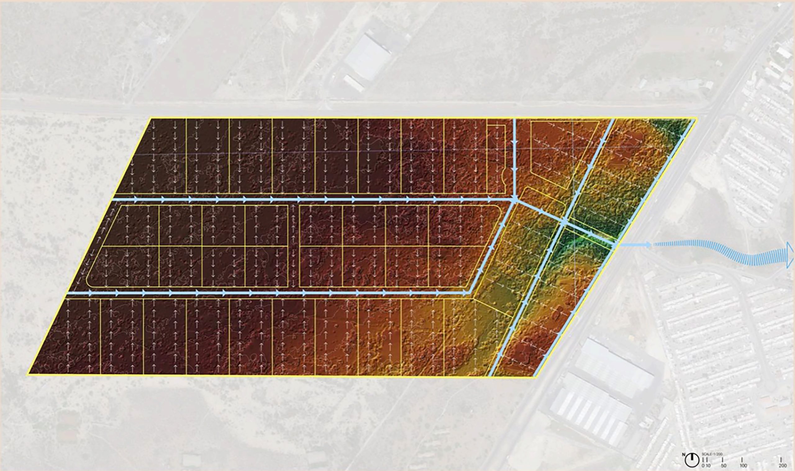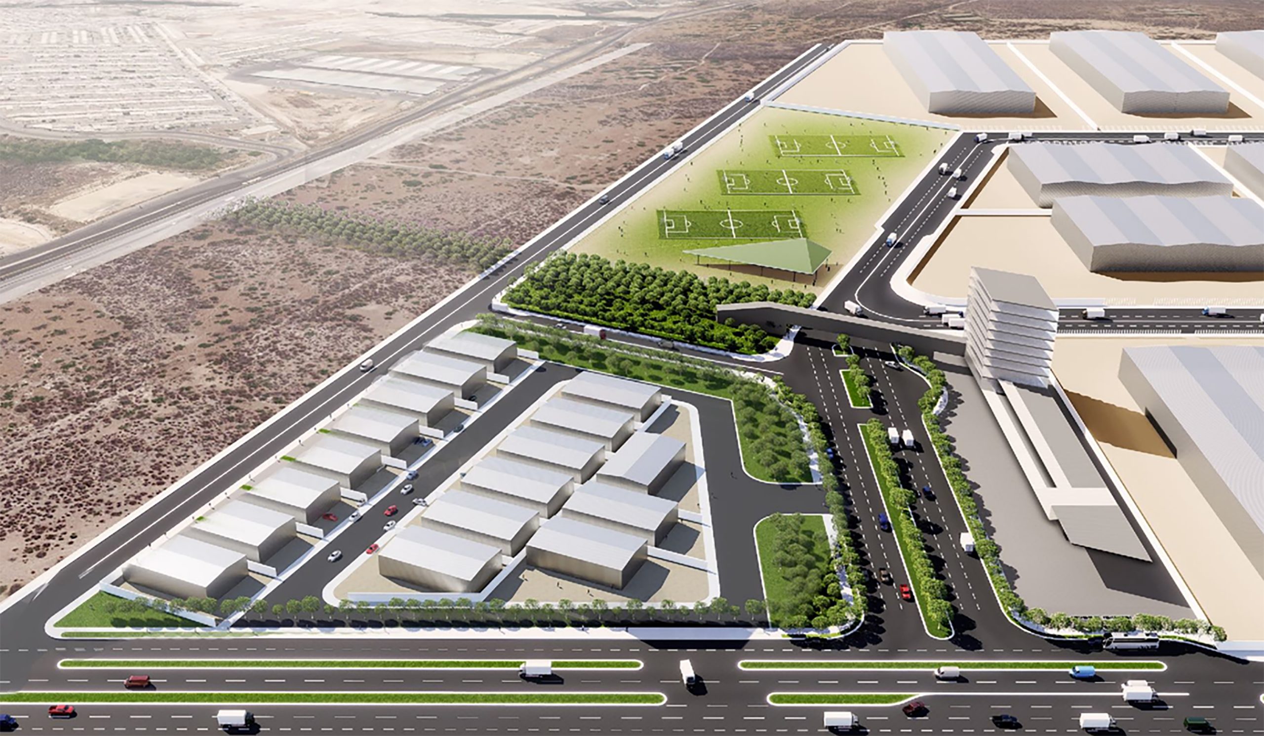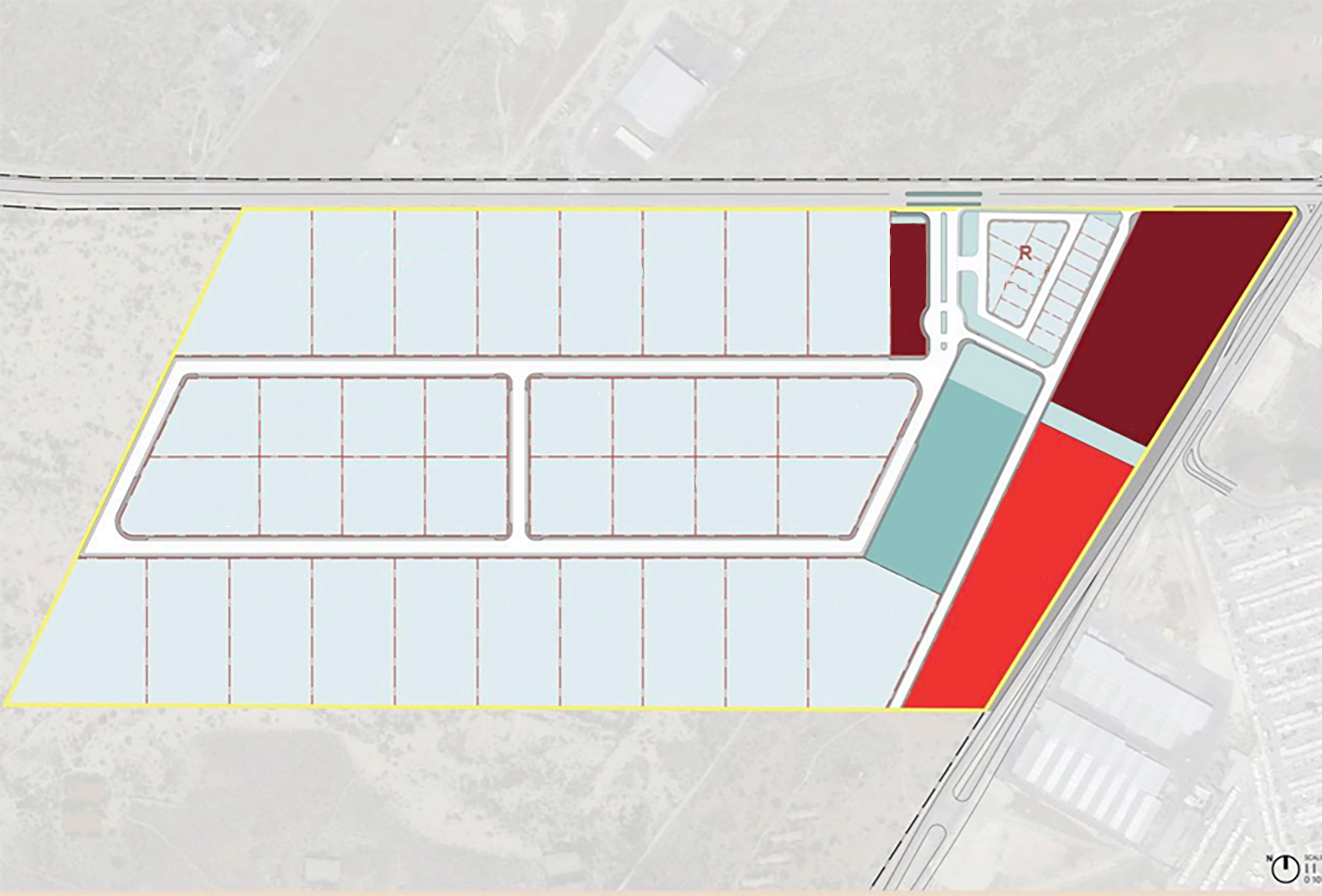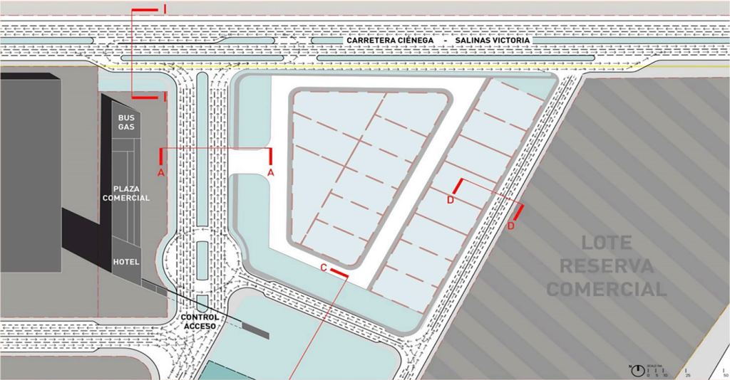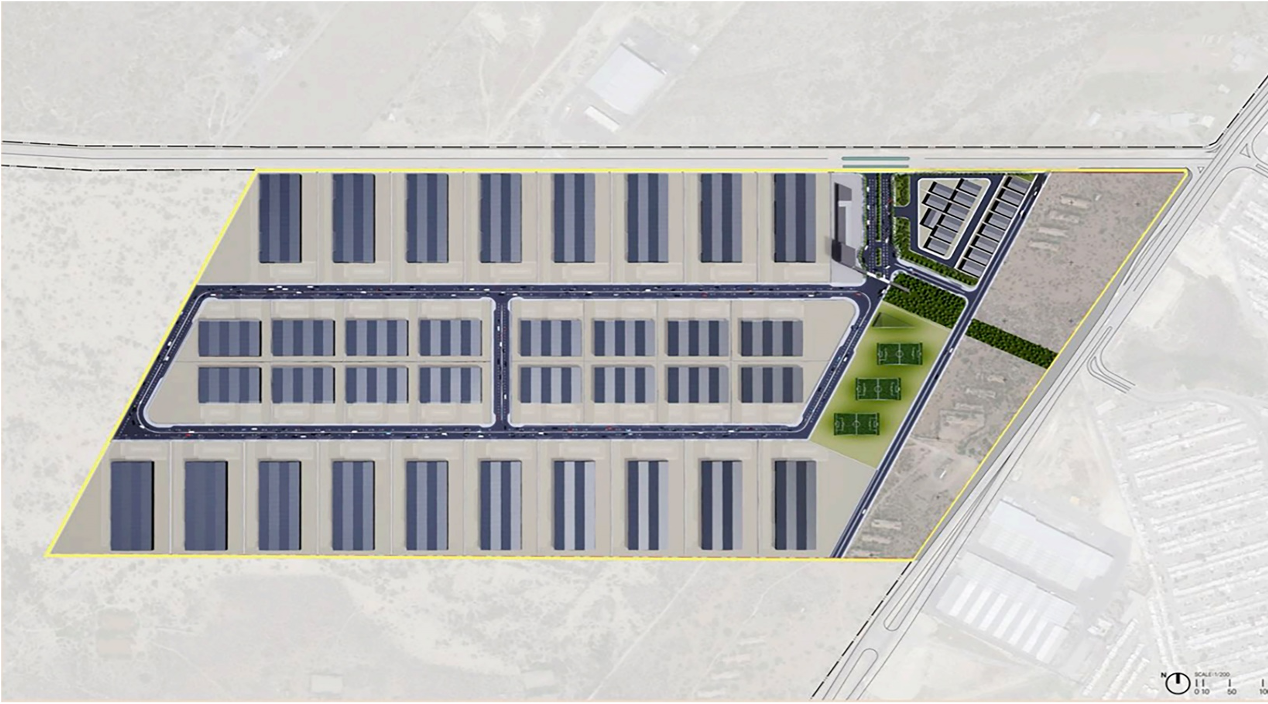 Dada la regularidad geométrica del predio y su topografía, el Master Plan permite un rendimiento de área neta rentable cercano al 80%. La estructura vial es fundamentalmente ortogonal buscando siempre la obtención de lotes con buena proporción de frente/fondo para un mejor aprovechamiento. El uso industrial del proyecto contempla el 67% del rendimiento total y su exposición y acceso a la Carretera Ciénega de Flores – Salinas Victoria le confiere una buena presencia comercial. Con una ubicación estratégica el «pocket park» es un soporte invaluable al resto del parque. Y la zona comercial con acceso directo a la carretera mencionada no solo es un amenity deseable sino un negocio rentable per se. Otro aspecto destacable del Master Plan es la unificación del área de donación concentrada en el centro del proyecto dándole accesibilidad a todos los usos.