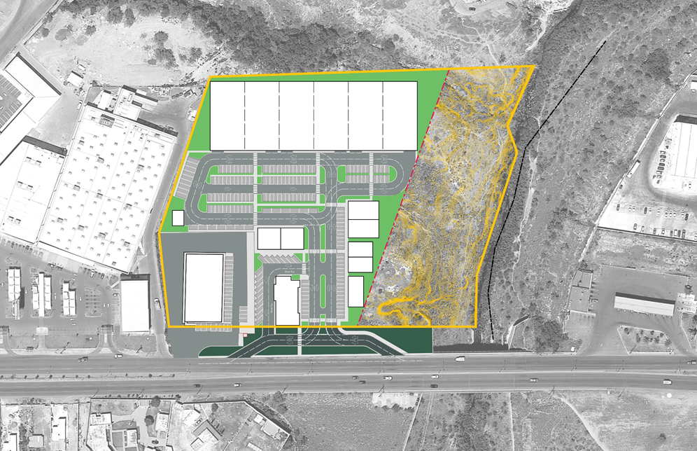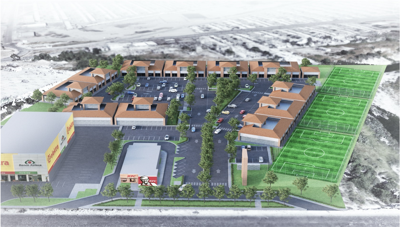 El predio tiene un área total bruta de 37,955 m² pero presenta afectaciones sobre la Ave. Lincoln y sobre el Río Pesquería lo que resulta en un área neta desarrollable de 20,634 m². De acuerdo al Plan de Desarrollo Urbano del Municipio Garcia, Nuevo León, el predio tiene un uso de suelo Habitacional y Corredor Urbano permitiendo el desarrollo de comercio y servicios con un COS del 75% y un CAS del 15%. Por la ubicación y nivel de desarrollo de su zona de influencia, el proyecto contempla un «strip convenience center» anclado con 6 naves de aproximadamente 1,000 m² cada una y dedicadas tanto al minoreo como al mayoreo de servicios especializados en construcción y decoración y complementado con 7 locales comerciales y un fast food restaurant en free standing.